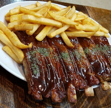 The Christmas Half Plate brings half a rack of ribs (6 ribs), two BBQ chicken legs, 150g of pulled pork, and again a ton of fries to go with your BBQ.