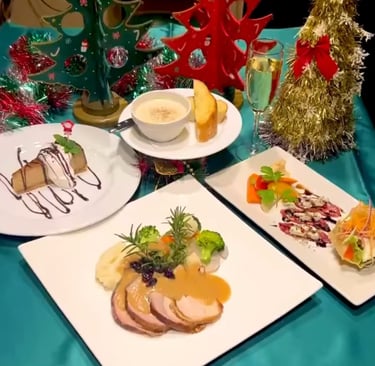 This Christmas Dinner is a winner every year! The Drunken Duck's Christmas course. This year's course includes: cauliflower cream soup, pickles, salami and truffle cream cheese, mozz and prosh salad, smoked turkey with gravy sauce, steamed vegetables and mashed potatoes, and one dessert of your choice: cheesecake, ice cream, or chocolate cake.