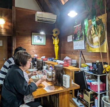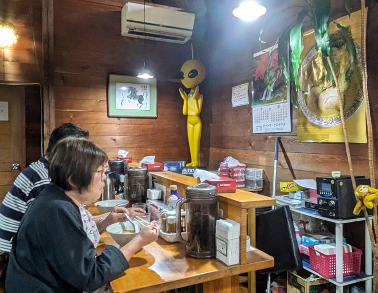 The Ibaraki Eats Duo waited for our ramen while still contemplating why the alien was in the corner.