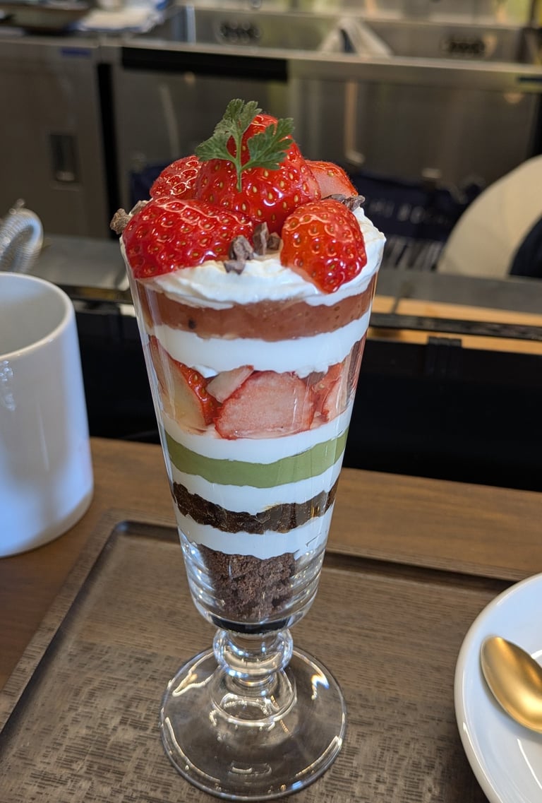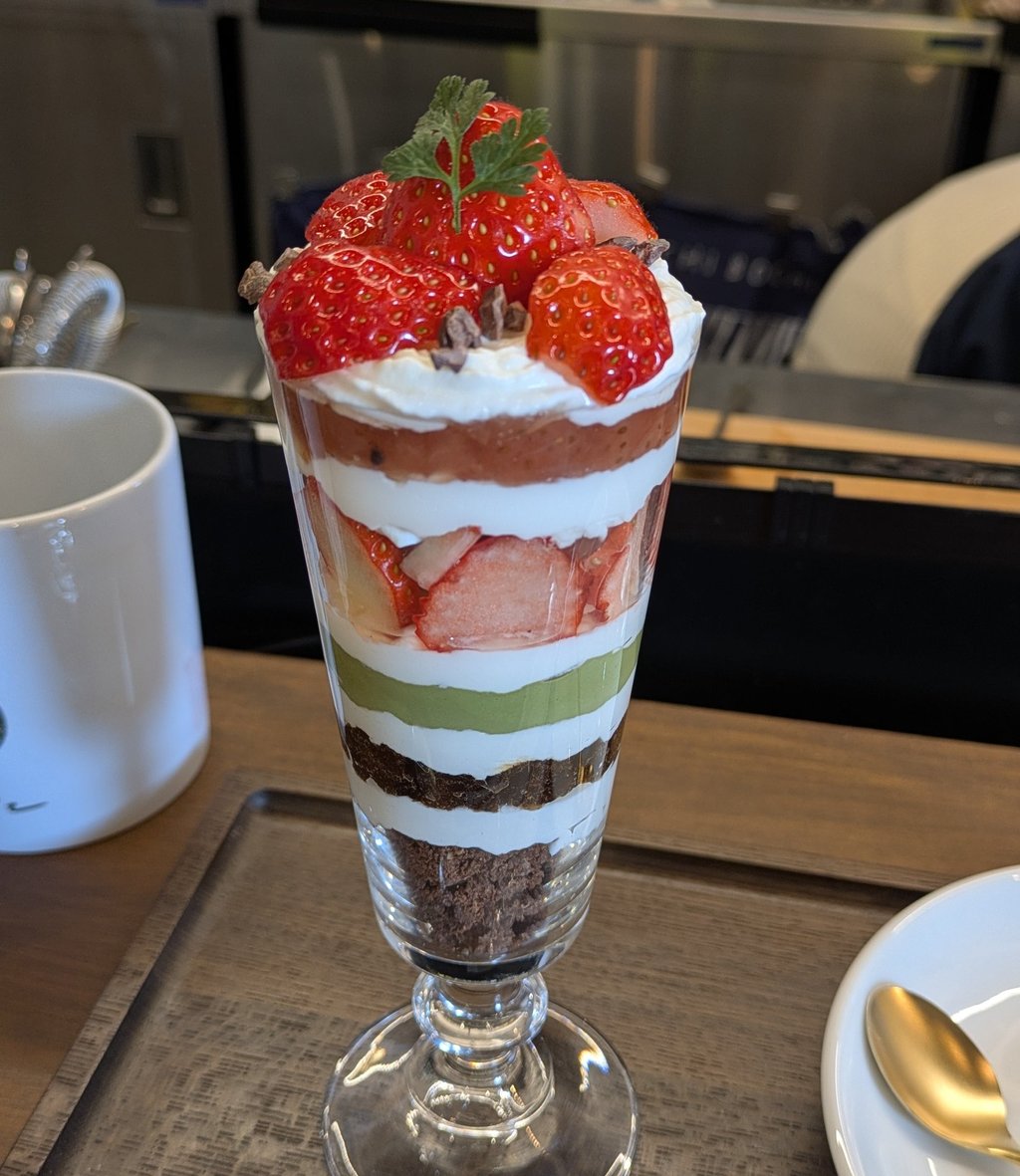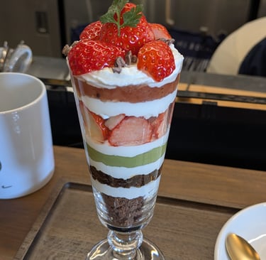 When we ordered it, I watched as the owner made the parfait right in front of us. He was completely focused, making sure every layer, every strawberry slice, and every dash of cream was perfect. It took him quite a while to make it, but watching the master at work was a great experience. Once he finished, he placed this incredible piece of parfait art in front of us. My wife took several pictures and admired it for a while before we finally dug in.